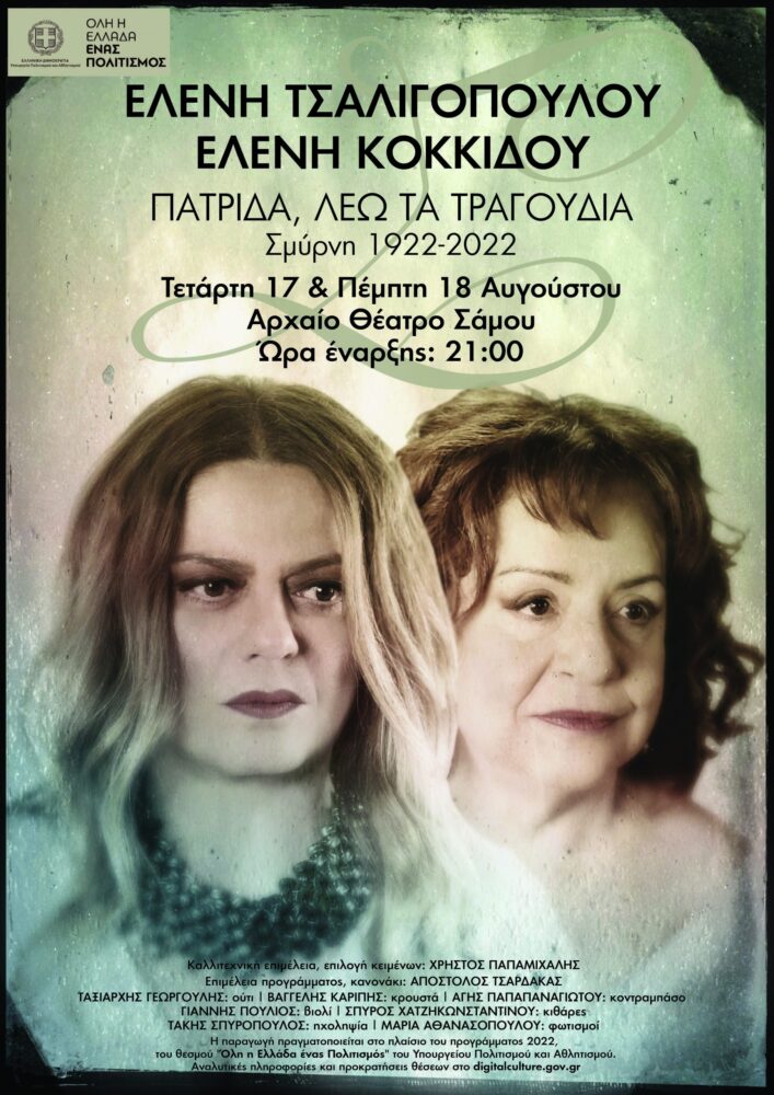 One hundred years later, on the occasion of the sad anniversary of the Asia Minor Catastrophe, Eleni Tsaligopoulou performs timeless songs from Smyrna and of composers of the time, while Eleni Kokkidou narrates testimonies of the uprooting and excerpts from relevant works of Greek literature. A concert full of history, dedicated to the memory that calls these songs its motherland, by two leading artists.